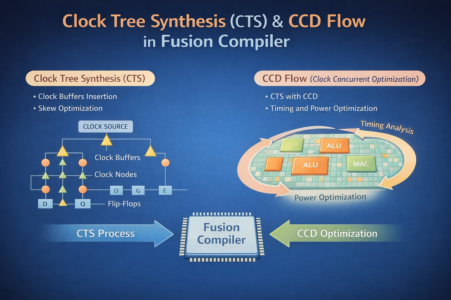 Clock Tree Synthesis (CTS) & CCD Flow in Synopsys Fusion Compiler focuses on building a balanced and optimized clock network while ensuring timing, power, and skew requirements are met. CTS is a critical stage in physical design because it directly impacts performance, reliability, and overall timing closure. In addition, the CCD (Clock Concurrent Optimization / Clock Concurrent Design flow in Fusion Compiler) enables simultaneous optimization of clock and data paths for better QoR and faster convergence.