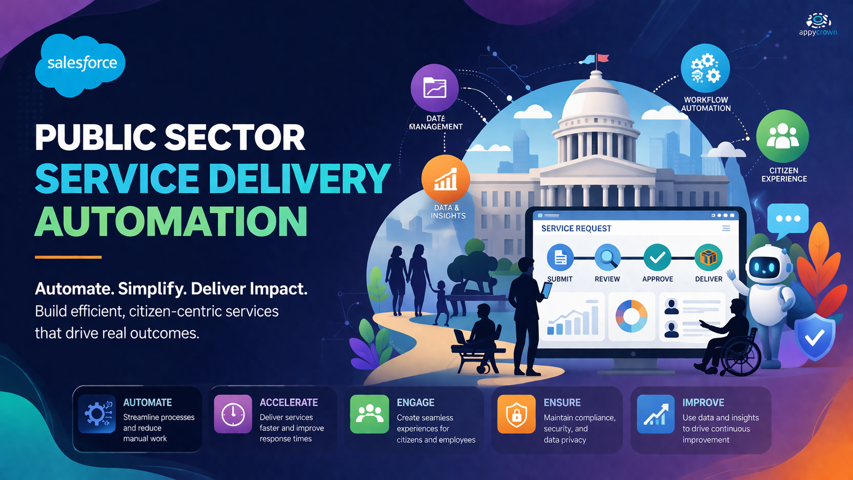 Salesforce Public Sector Service Delivery Automation enables government and public sector agencies to streamline service delivery processes, automate case and workflow management, and improve citizen engagement. It supports regulatory compliance, efficient service routing, and transparency in operations.